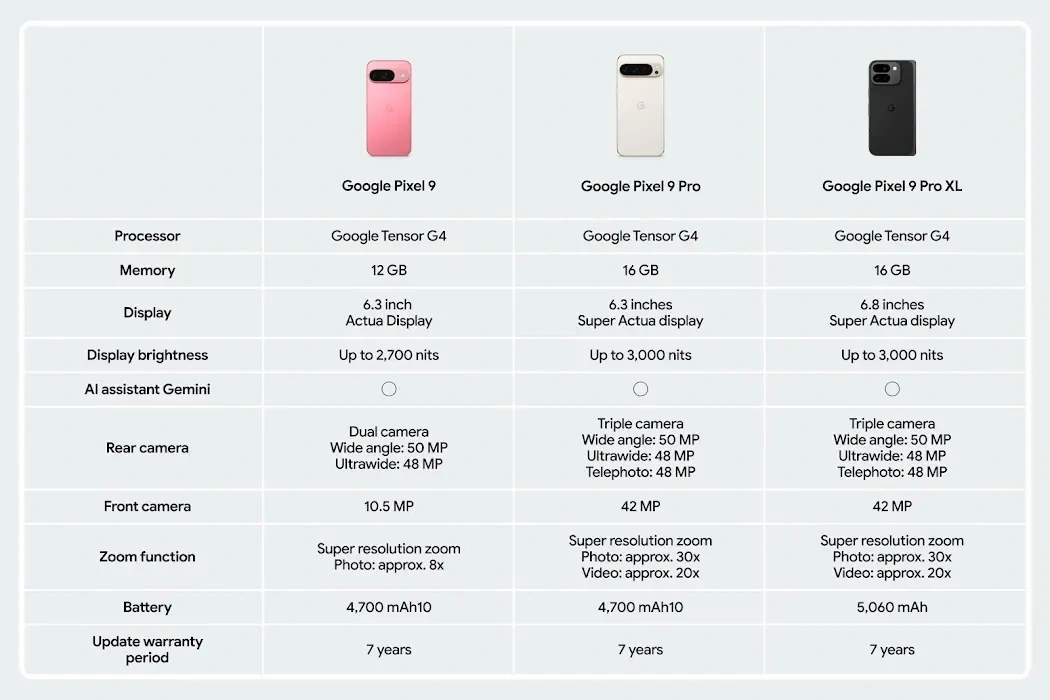 50MP f/1.68 + 48MP ultrawide + 48MP telephoto | 6.3" Super Actua, 3000 nits | Tensor G4 | 4700 mAh | $999 | 5x optical zoom, 8K@30fps video, 42MP selfie camera | |