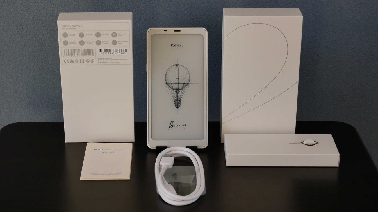 My white Palma 2 sat nestled inside, protected by a plastic film. The gray frame around the screen complements the e-ink display beautifully. This white variant creates a more harmonious look compared to the black model I've seen in photos.