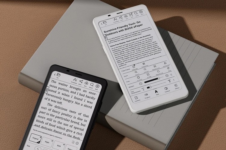 The device looks just like a modern smartphone but feels different thanks to its paper-like texture on the back that gives you an excellent grip. Note that despite its smartphone-like appearance, this device serves purely as an e-reader without any SIM functionality.