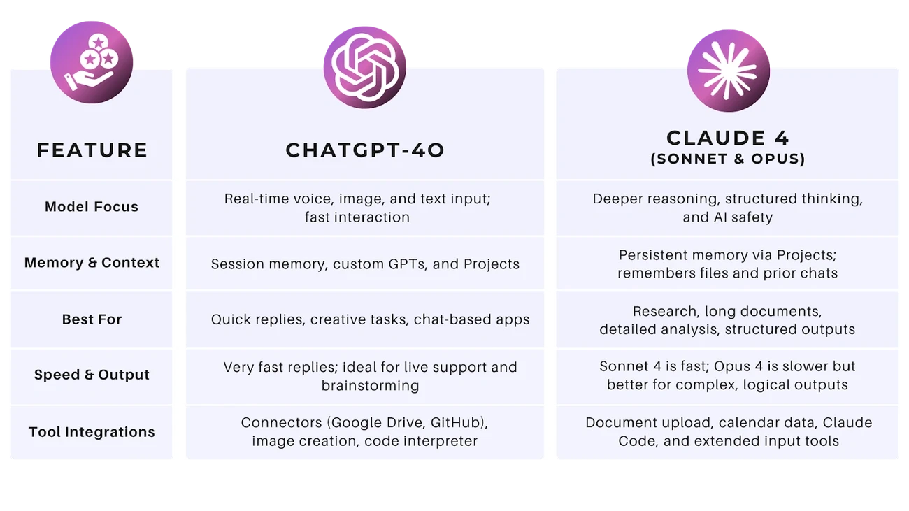 Technical performance varies significantly based on project requirements and development contexts. ChatGPT-4o excels at rapid code generation and real-time problem solving through its code interpreter, delivering faster results for debugging tasks. Claude Sonnet 4 and Claude Opus 4 feature the new Claude Code environment, which maintains substantial long-term memory across multi-file projects.